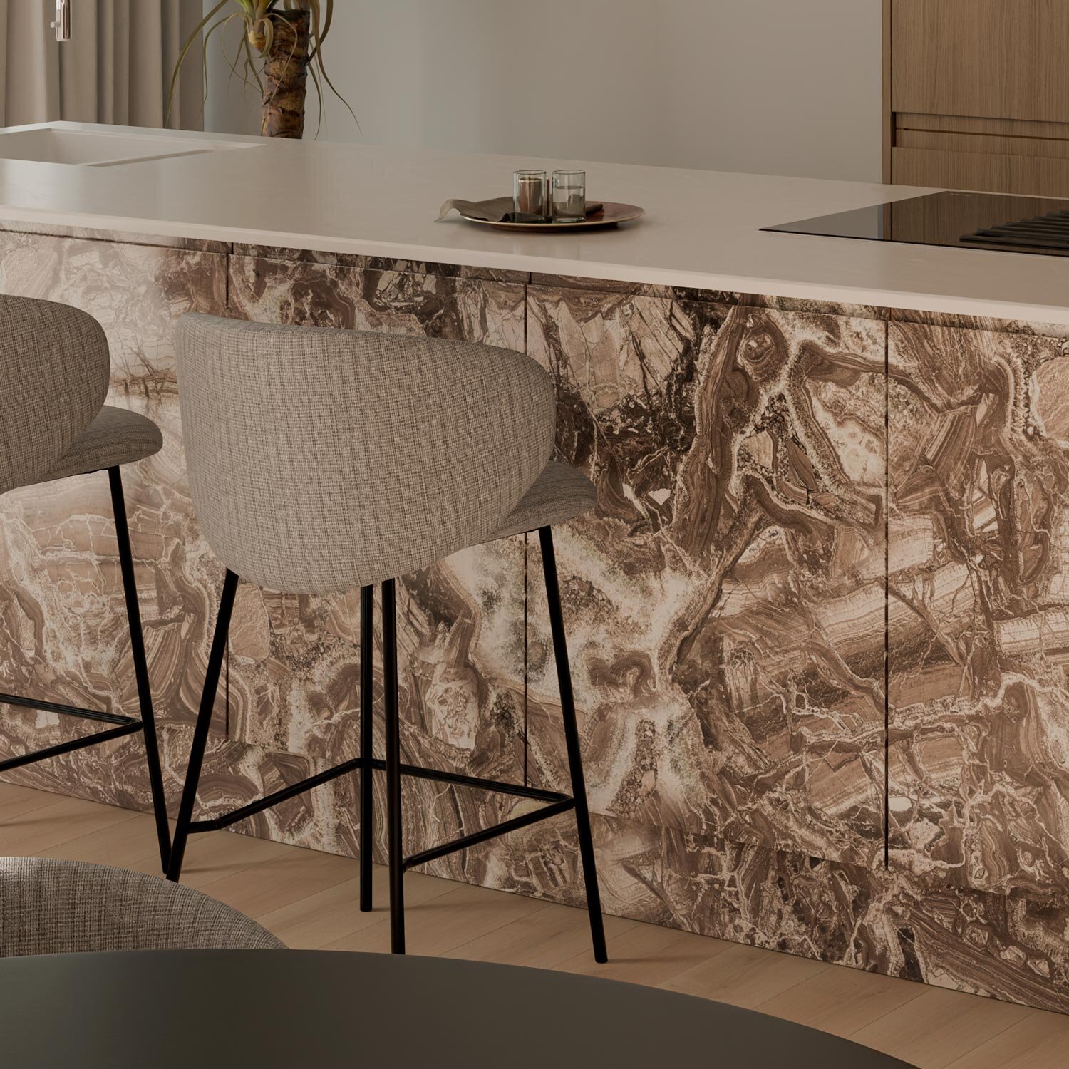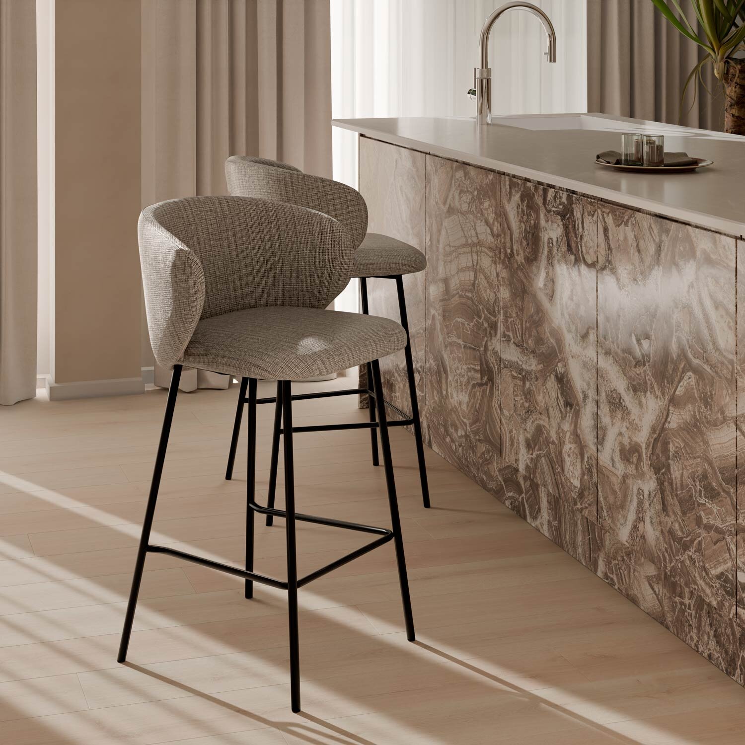 Añade un toque de elegancia sin renunciar a la comodidad con el taburete bajo RAY. Esta pieza destaca por su diseño moderno y funcionalidad. Su respaldo alto y ergonómico proporciona un excelente soporte para la espalda, mientras que el asiento acolchado ofrece un confort adicional, convirtiendo al taburete RAY en la opción ideal para cocinas, bares o áreas de descanso. El reposapiés integrado no solo mejora la estabilidad del taburete, sino que también ofrece un lugar cómodo para descansar los pies. El tejido en color taupe, confeccionado en 100% poliéster, aporta un aspecto sofisticado y elegante.