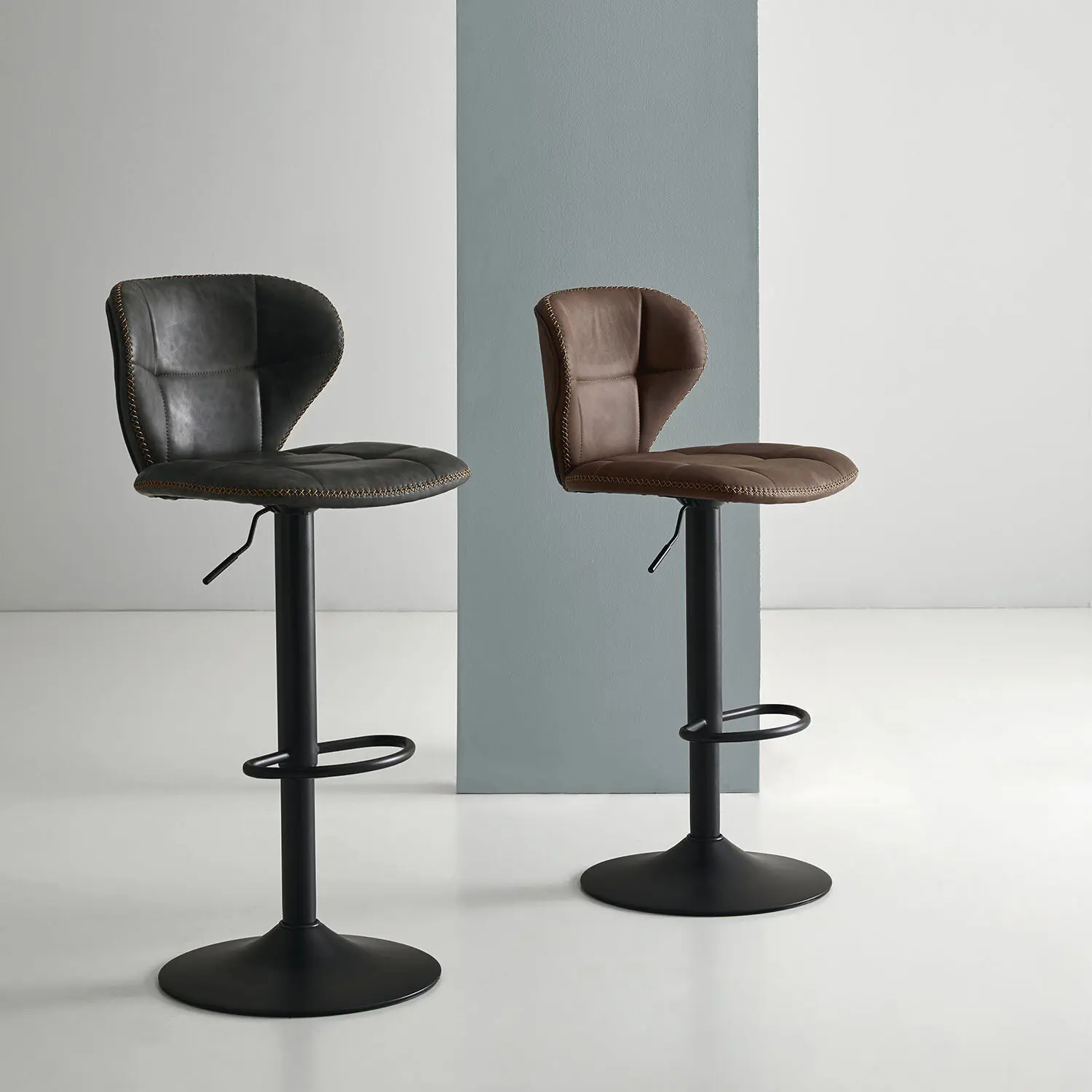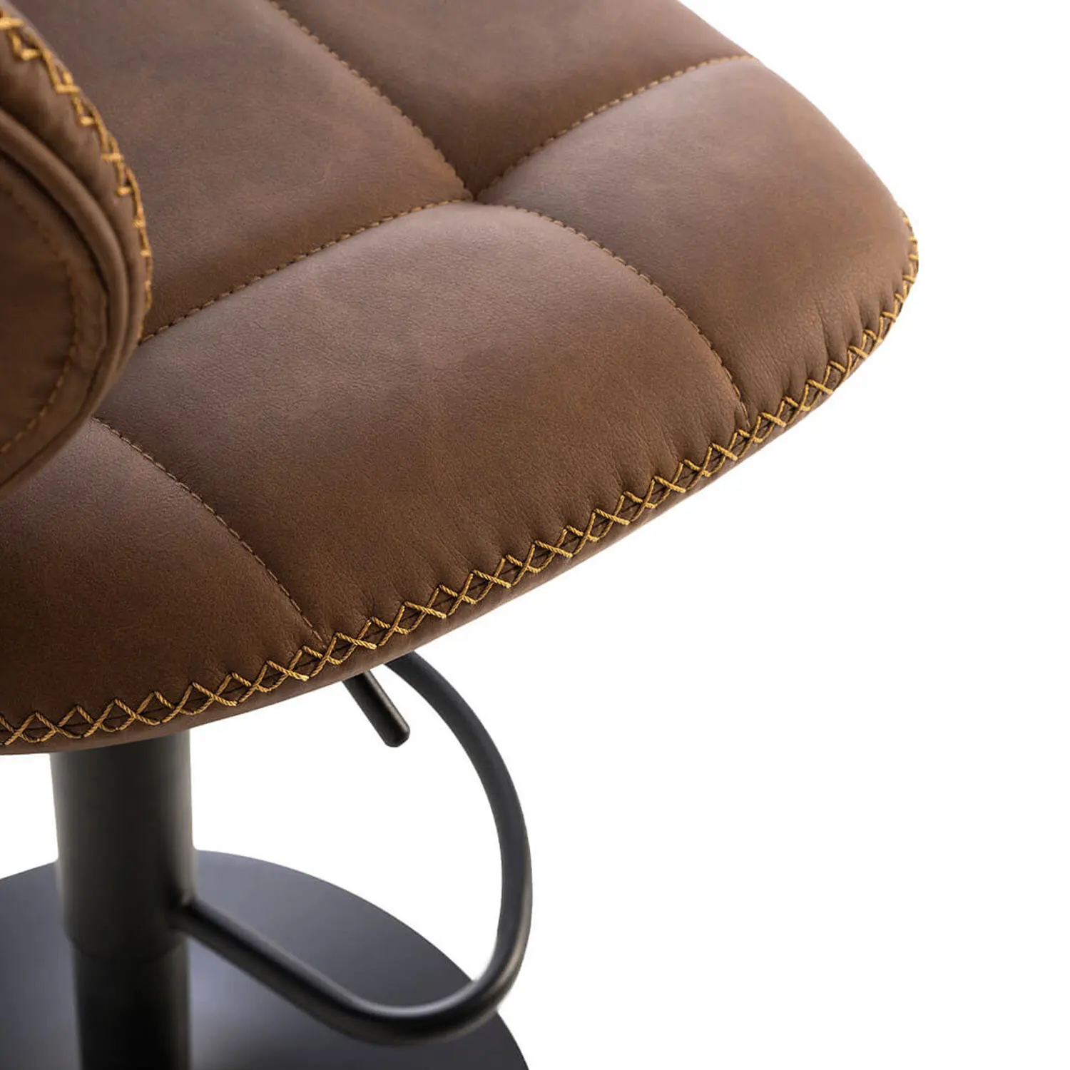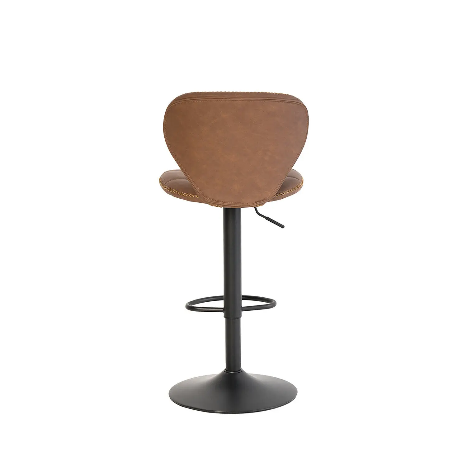 El taburete PIPER se adapta perfectamente a cualquier espacio gracias a su diseño industrial y elegante. Cuenta con una base circular y una columna delgada metálica en color negro, que le confieren un toque sofisticado y estabilidad. El asiento y el respaldo están tapizados en polipiel marrón, con costuras visibles que añaden un toque de estilo adicional. El respaldo, ligeramente curvado, proporciona un soporte extra, mientras que el reposapiés integrado aumenta la comodidad. Además, el taburete PIPER ofrece una rotación de 360º y permite ajustar su altura mediante un sistema de pistón, brindando una versatilidad excepcional.