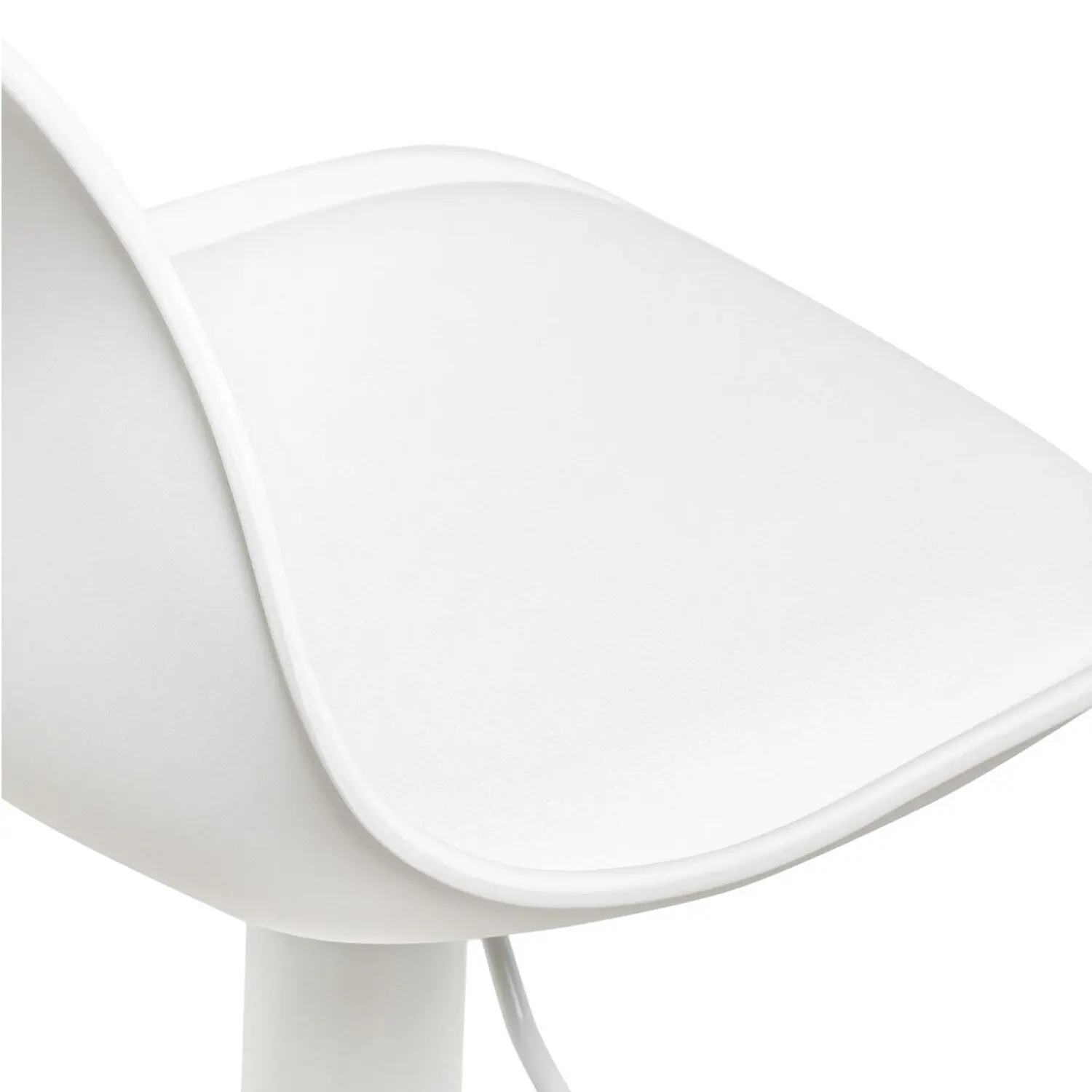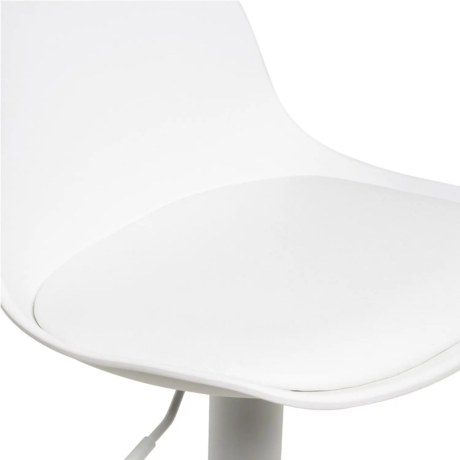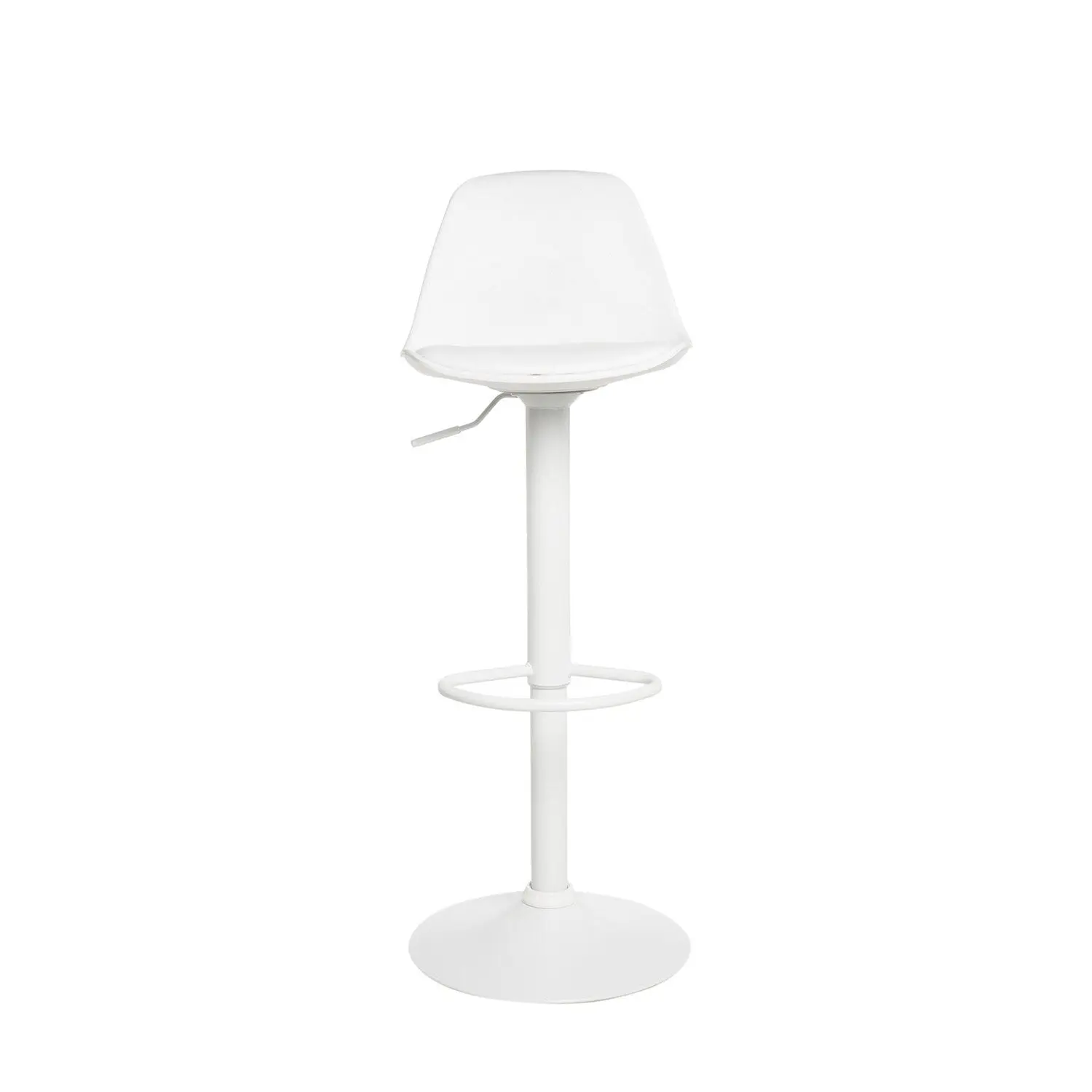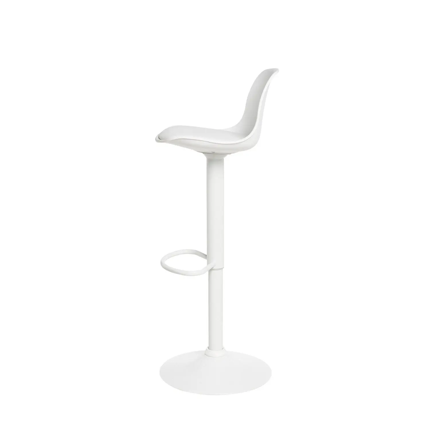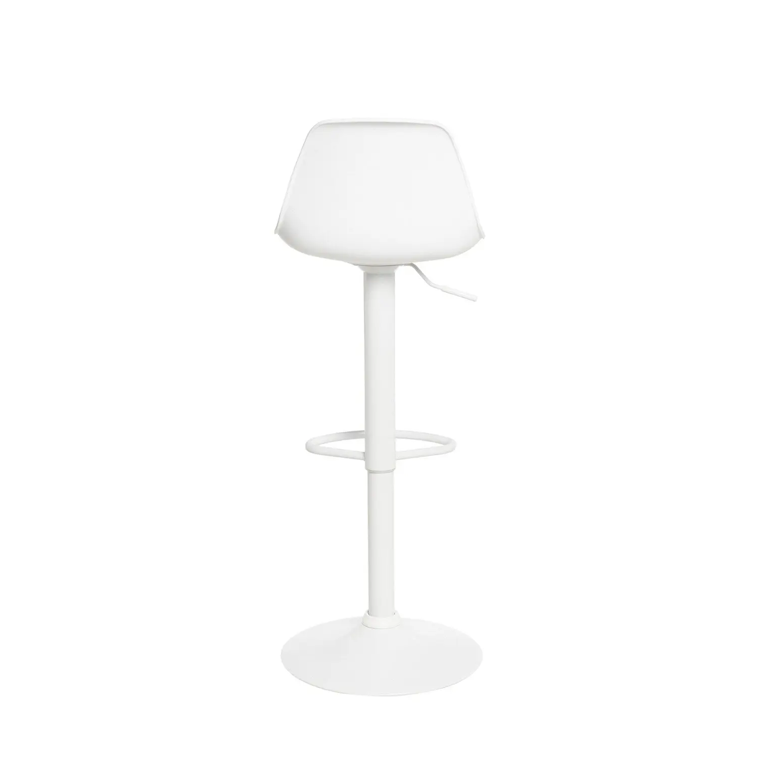 Taburete compuesto por un asiento acolchado y respaldo de polipropileno cóncavo, diseñado para ofrecer comodidad en el uso diario. La estructura metálica en color blanco, combinada con un reposapiés delantero y una base circular, le confiere un aspecto elegante y moderno. Cuenta con un sistema de elevación por pistón y es giratorio 360º. El taburete SADIE es perfecto para barras de bar o barras bajas de cocina.