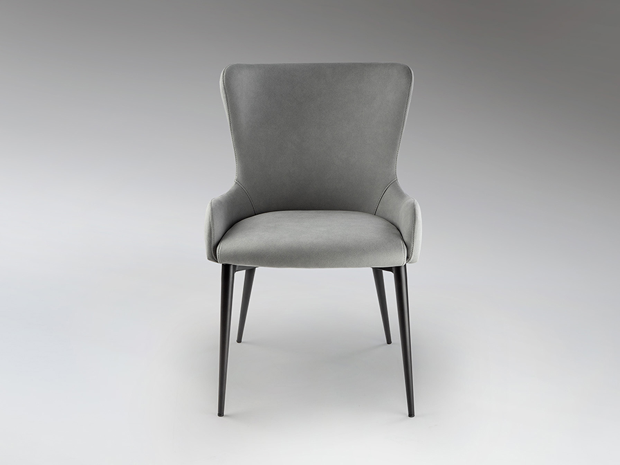 Silla realizada en metal, acabado negro mate. Asiento y respaldo de madera contrachapada y espuma. Tapizado textil de poliéster 100% en color gris claro. Limpieza en seco.