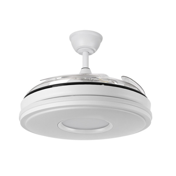 Detalles: Color: Blanco. Peso Neto: 4040. Peso Bruto: 5155. Medidas embalaje: 53X53X16,5. Dimensiones (alto x ancho x fondo): 34,5/42X50/107. Material: Metal / ABS / Policarbonato. Potencia: 59 W. Lúmenes: 6980. Temperatura luz: 3000-4000-6000. Voltaje: 220-240 V. Clasificación energética: E. Color de la luz: Blanco Cálido, Frío y Natural. Uso (Interior/Exterior): Recomendado para interiores. Tipo de iluminación: Tecnología LED integrada. Proyección de la luz: Luz difusa general. Tipo de instalación: En superficie. Intensidad regulable: Intensidad regulable. Mando a distancia incluido: Mando a distancia incluido. Ahorro de energía: Ahorro de energía. Uso (Doméstico/Profesional): Doméstico. Número de aspas: 4. Número de velocidades ajustables: 6. Control de aire para verano o invierno: Verano e Invierno. Medida del diámetro (cm.): 107. _Velocidad_1_Consumo: 7. _Velocidad_2_Consumo: 12. _Velocidad_3_Consumo: 17. _Velocidad_4_Consumo: 22. _Velocidad_5_Consumo: 27. _Velocidad_6_Consumo: 32. _Velocidad_1_RPM: 160. _Velocidad_2_RPM: 180. _Velocidad_3_RPM: 190. _Velocidad_4_RPM: 200. _Velocidad_5_RPM: 220. _Velocidad_6_RPM: 240. _Velocidad_1_Flujo Aire: 3378. _Velocidad_2_Flujo Aire: 4323. _Velocidad_3_Flujo Aire: 5702. _Velocidad_4_Flujo Aire: 6898. _Velocidad_5_Flujo Aire: 7963. _Velocidad_6_Flujo Aire: 8958. _Velocidad_1_Nivel Sonido: 20. _Velocidad_2_Nivel Sonido: 25. _Velocidad_3_Nivel Sonido: 30. _Velocidad_4_Nivel Sonido: 35. _Velocidad_5_Nivel Sonido: 40. _Velocidad_6_Nivel Sonido: 45. Tipo de motor: Motor DC. Color de luz regulable: Color de luz seleccionable en 3 posiciones. Memoria: Memoria de color incorporada. Certificado CE: true. Certificado Reciclaje: true. Temporizador ventilador: 2H / 4H. CRI: >85. Material Motor: Metal / Policarbonato. Material Aspas: ABS. Color Motor: Blanco. Color Aspas: Transparente. Incluye Tija de dos medidas: 12,5 cm y 20 cm. Apto para techo inclinado: Sí. CAJA MASTER (unidades): 1. Tamaño del diámetro: Mediano: Entre 108cm y 131 cm. Tamaño: L. Diámetro cerrado: 50. Diámetro abierto: 107. Dimmable: Dimmable. Tres temperaturas de Luz: Tres temperaturas de Luz