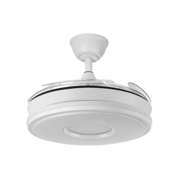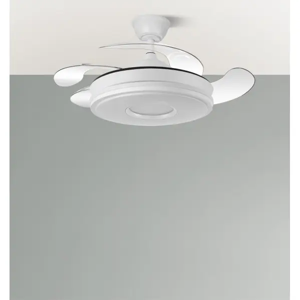 Detalles: Color: Blanco. Peso Neto: 2930. Peso Bruto: 4105. Medidas embalaje: 44,8X44,8X17. Dimensiones (alto x ancho x fondo): 34,5/42X40/91. Material: Metal / ABS / Policarbonato. Potencia: 59 W. Lúmenes: 6980. Temperatura luz: 3000-4000-6000. Voltaje: 220-240 V. Clasificación energética: E. Color de la luz: Blanco Cálido, Frío y Natural. Uso (Interior/Exterior): Recomendado para interiores. Tipo de iluminación: Tecnología LED integrada. Proyección de la luz: Luz difusa general. Tipo de instalación: En superficie. Intensidad regulable: Intensidad regulable. Mando a distancia incluido: Mando a distancia incluido. Ahorro de energía: Ahorro de energía. Uso (Doméstico/Profesional): Doméstico. Número de aspas: 4. Número de velocidades ajustables: 6. Control de aire para verano o invierno: Verano e Invierno. Medida del diámetro (cm.): 91. _Velocidad_1_Consumo: 7. _Velocidad_2_Consumo: 12. _Velocidad_3_Consumo: 17. _Velocidad_4_Consumo: 22. _Velocidad_5_Consumo: 27. _Velocidad_6_Consumo: 32. _Velocidad_1_RPM: 170. _Velocidad_2_RPM: 190. _Velocidad_3_RPM: 210. _Velocidad_4_RPM: 230. _Velocidad_5_RPM: 250. _Velocidad_6_RPM: 270. _Velocidad_1_Flujo Aire: 2702. _Velocidad_2_Flujo Aire: 3458. _Velocidad_3_Flujo Aire: 4561. _Velocidad_4_Flujo Aire: 5518. _Velocidad_5_Flujo Aire: 6370. _Velocidad_6_Flujo Aire: 7166. _Velocidad_1_Nivel Sonido: 34,3. _Velocidad_2_Nivel Sonido: 35,1. _Velocidad_3_Nivel Sonido: 35,9. _Velocidad_4_Nivel Sonido: 37,2. _Velocidad_5_Nivel Sonido: 38,3. _Velocidad_6_Nivel Sonido: 40. Tipo de motor: Motor DC. Color de luz regulable: Color de luz seleccionable en 3 posiciones. Memoria: Memoria de color incorporada. Certificado CE: true. Certificado Reciclaje: true. Temporizador ventilador: 2H / 4H. CRI: >85. Material Motor: Metal / Policarbonato. Material Aspas: ABS. Color Motor: Blanco. Color Aspas: Transparente. Incluye Tija de dos medidas: 12,5 cm y 20 cm. Apto para techo inclinado: Sí. Tamaño del diámetro: Pequeño: Hasta 107 cm. Tamaño: S. Diámetro cerrado: 40. Diámetro abierto: 91. Dimmable: Dimmable. Tres temperaturas de Luz: Tres temperaturas de Luz