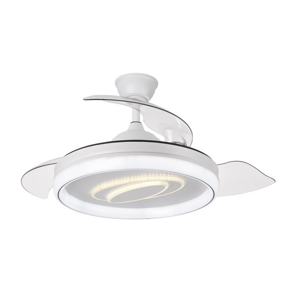 Ventilador DC de la serie MARACANA realizado en metal, policarbonato y ABS, en color BLANCO con tres aspas DESPLEGABLES de ABS transparente muy resistentes. Diseño muy moderno y original, con bonito juego de luces. Tiene seis velocidades ajustables. Tecnología LED integrada con una potencia de 57W, con 3 TEMPERATURAS SELECCIONABLES DE LUZ (3000-4500-6500K) y 5980 lúmenes. Control de aire verano o invierno. Su medida es de 34,5/42X50 centímetros con las aspas plegadas y de 34,5/42X107 centímetros con las aspas desplegadas. Incluye dos tijas de 12,5 y 20 centímetros, para colocar a distintas alturas. Mando a distancia INCLUIDO, REGULABLE EN INTENSIDAD, con MEMORIA DE COLOR incorporada y TEMPORIZADOR 2/4 H. Puede utilizar el control VIA APP : FAN LAMP PRO, desde el que podrá manejar también su ventilador de manera fácil e intuitiva desde su móvil. Modelo disponible en color blanco y en negro.
