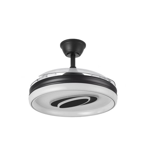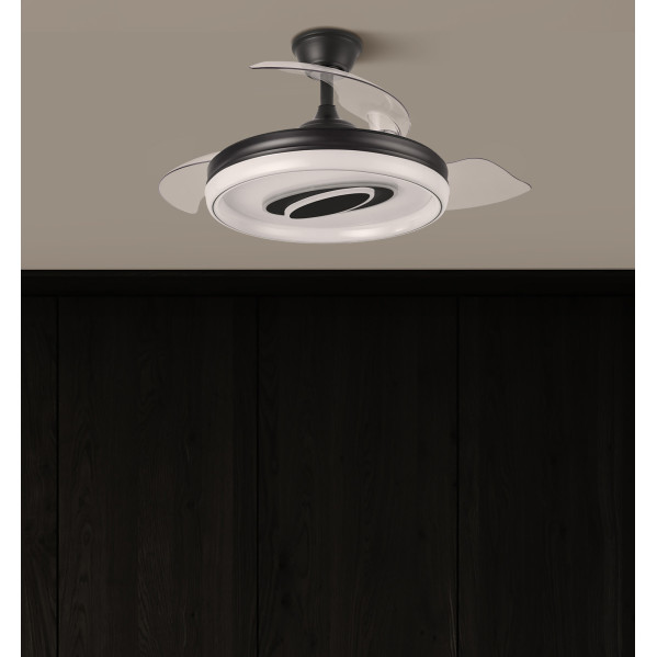 Ventilador DC de la serie MARACANA realizado en metal, policarbonato y ABS, en color NEGRO con tres aspas DESPLEGABLES de ABS transparente muy resistentes. Diseño muy moderno y original, con bonito juego de luces. Tiene seis velocidades ajustables. Tecnología LED integrada con una potencia de 57W, con 3 TEMPERATURAS SELECCIONABLES DE LUZ (3000-4500-6500K) y 5980 lúmenes. Control de aire verano o invierno. Su medida es de 34,5/42X50 centímetros con las aspas plegadas y de 34,5/42X107 centímetros con las aspas desplegadas. Incluye dos tijas de 12,5 y 20 centímetros, para colocar a distintas alturas. Mando a distancia INCLUIDO, REGULABLE EN INTENSIDAD, con MEMORIA DE COLOR incorporada y TEMPORIZADOR 2/4 H. Puede utilizar el control VIA APP : FAN LAMP PRO, desde el que podrá manejar también su ventilador de manera fácil e intuitiva desde su móvil. Modelo disponible en color blanco y en negro.