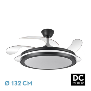 Ventilador de techo con luz LED DIMABLE y temperatura color regulable CCT. Realizado en metal acabado blanco mate y aro en blanco. Difusor opal y aspas escamoteables en acrílico transparente. Motor DC de 6 velocidades e inversión.Temporizador.