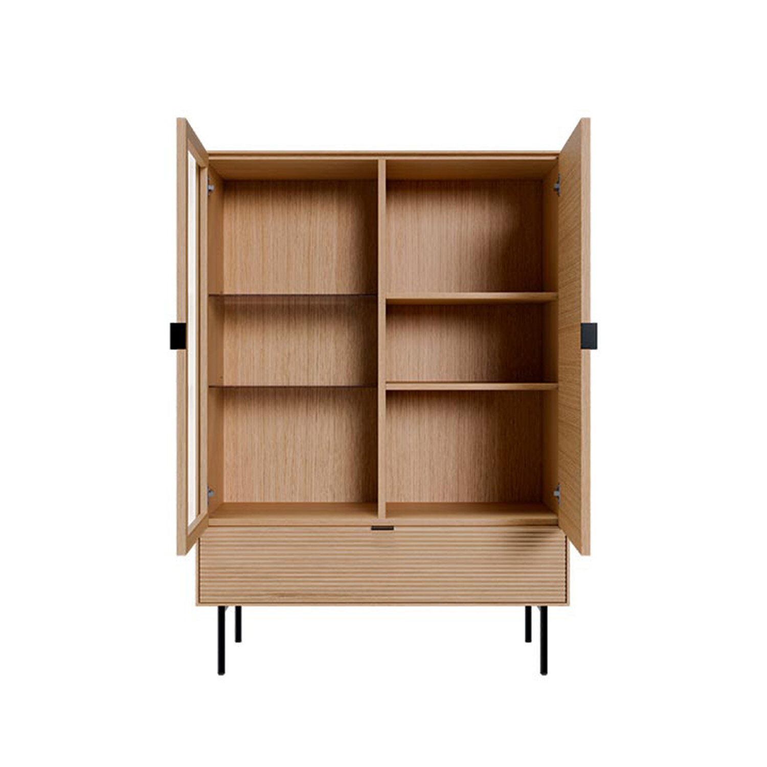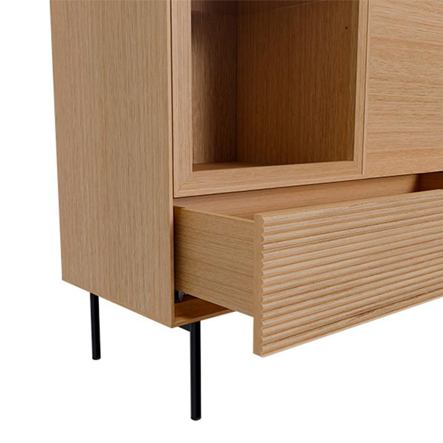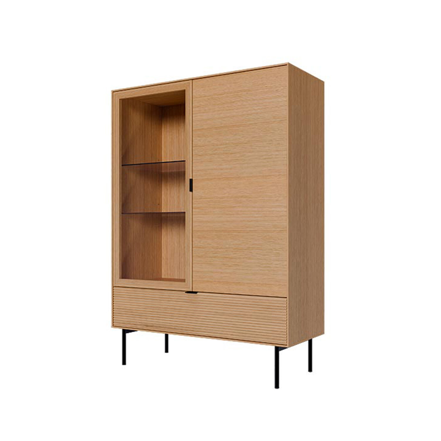 La vitrina baja TULSA combina diseño funcional y estética natural en una pieza compacta y versátil. Su estructura en chapa de roble y los frentes en madera maciza rayada aportan calidez y textura, realzando su carácter acogedor. Cuenta con una puerta de chapa de roble, una puerta abatible de cristal y un cajón, permitiendo almacenar y exhibir con equilibrio. El sistema soft closing y las guías ocultas aseguran una apertura suave, mientras que las patas y tiradores metálicos en negro suman un toque contemporáneo. Ideal para salones o comedores con estilo sereno y actual.