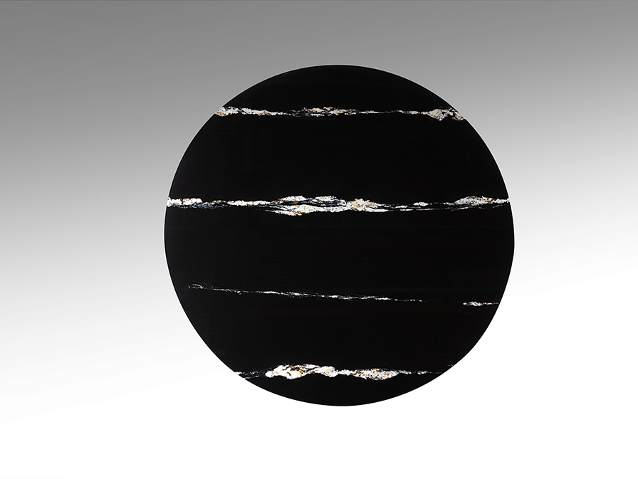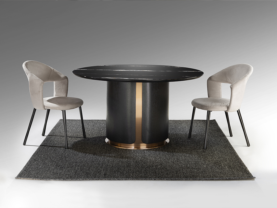 Mesa de comedor redonda realizada en DM chapado en roble oscuro, acero inoxidable acabado oro rosa y tapa de mármol negro veteado.